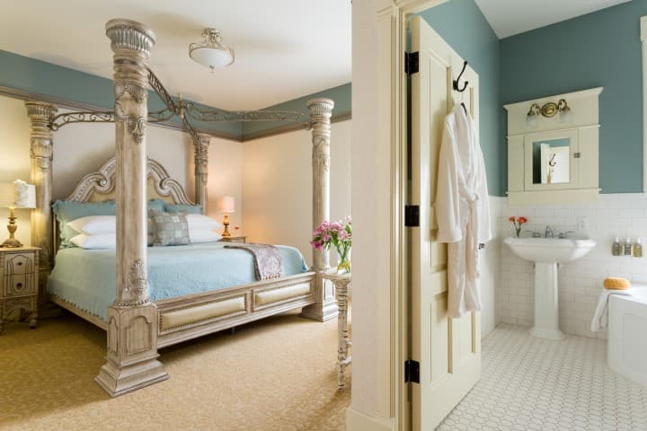 Suite 201 is a cozy 189 square foot suite features an ornate queen-sized antique iron bed and an antique dresser and mirror. The suite overlooks the Historic Elgin Hotel courtyard and includes a private bath with shower/tub combo.