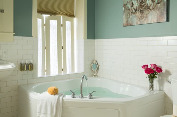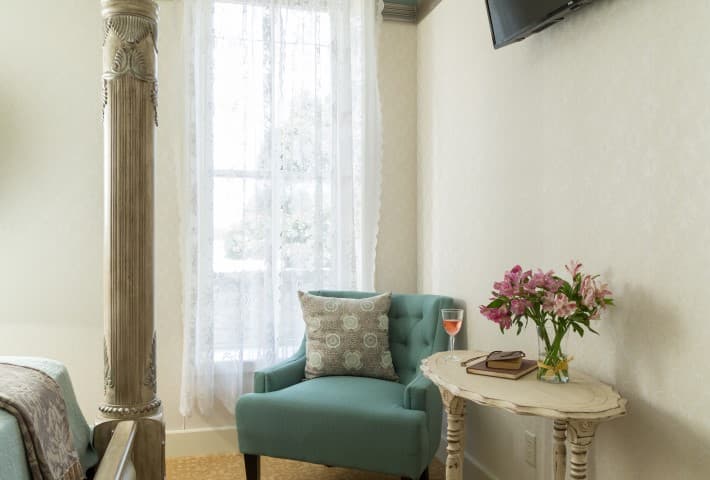 Suite 203 is a cozy 189 square foot suite is furnished with an iron queen-sized bed and an antique dresser and reading chair. Views of the Historic Elgin Hotel courtyard light up the suite. The suite includes a private bath with shower/tub combo.