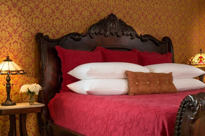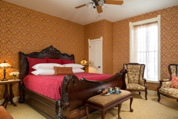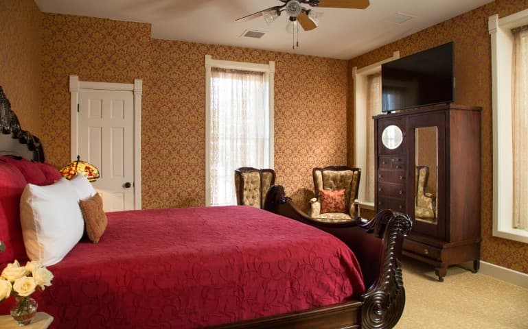 A wonderful suite for special occasions or those in need of space, this 250 square foot suite is crowned with a beautiful king-sized sleigh bed, an antique dresser and mirror, and a mirrored wardrobe. Two comfortable antique chairs provide a place to relax and reconnect. The suite includes a private bath with shower/tub combo.