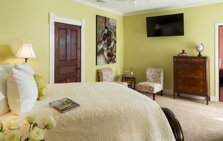 This romantic 398 square foot suite features a beautiful queen bed, an antique dresser and mirror, chest of drawers, secretariat desk, and two reading chairs. The suite overlooks the Historic Elgin Hotel courtyard and includes a spacious walk-in closet with a mini-frig. The private bath features the amazing two-person "fun tub" fronted by a gas fireplace and a separate glass shower. Suite 309 can be combined with 310 and 311 for a three-room suite with private living area.